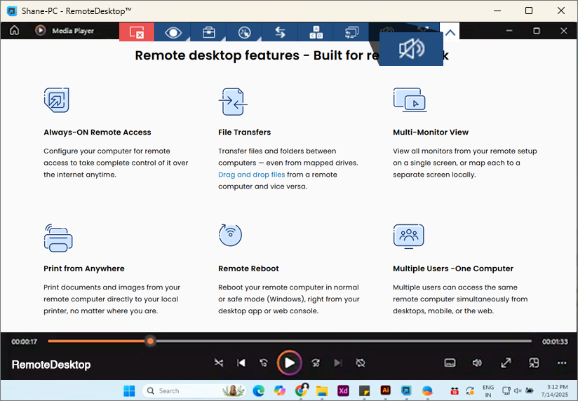 Remote Desktop lets you access and manage your remote computers anytime, from any device, provided that the computer has an active Internet connection and the Remote Desktop application is installed on it. You can sign in to your home or office computer from any location, manage your files, and work on your computer - as if you are sitting right in front of it. You can even invite an associate to access your computer to work on a presentation or help you troubleshoot.